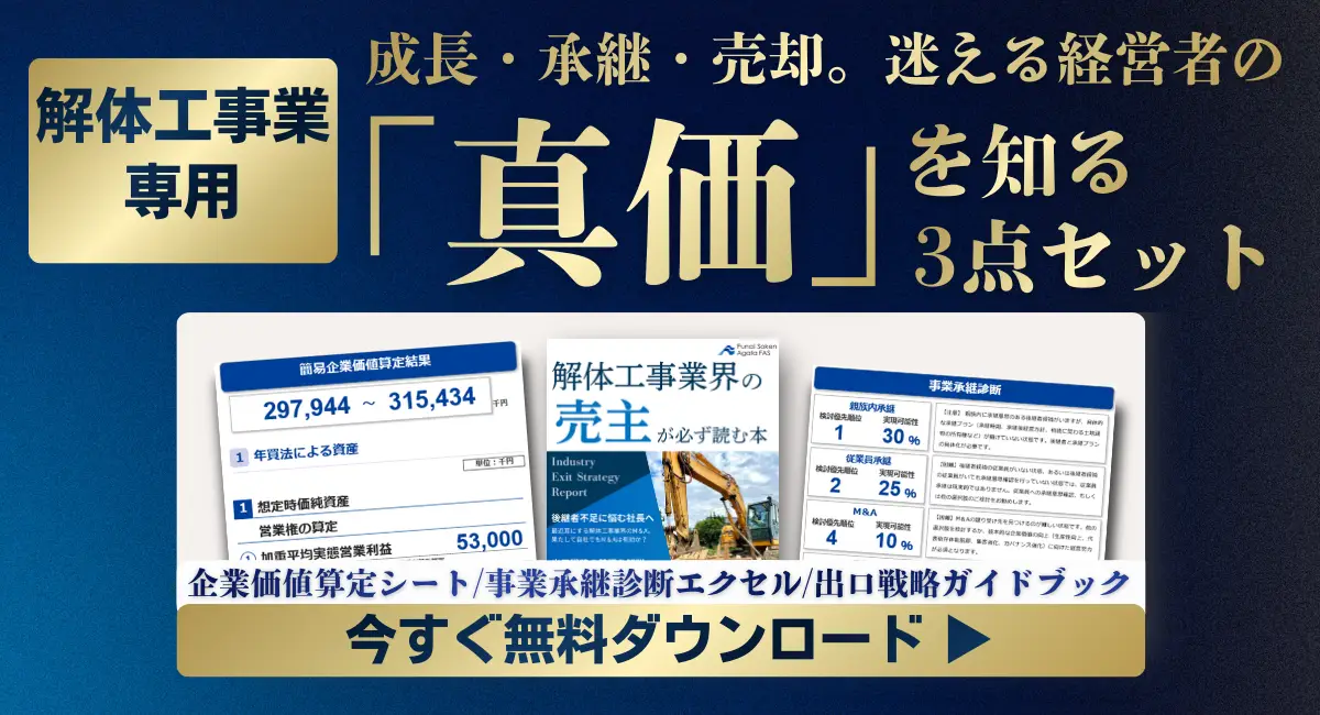 この記事では「解体工事業界のM&A」について、業界特有の評価ポイントや高値譲渡の条件、異業種参入の動向などを、業界専門のM&Aコンサルタントが徹底解説し、読了後には自社の本当の市場価値が理解できるようになります。