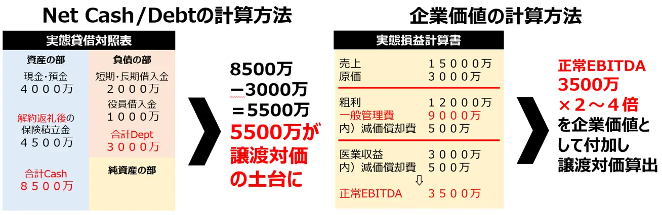 Net Cash/Debtとは、現金預金と保険積立金等を時価評価に直したうえで、その総額から有利子負債をマイナスすることで求めることが出来る、医院価値の基礎たる部分です。有利子負債を差し引いて医院・法人がいくらの現金同等物を保有しているか、といった方が分かりやすいかもしれません。