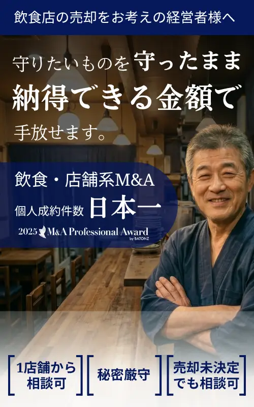 飲食・店舗系M&A個人成約数日本一(25年)累計100件以上の売却支援実績。 赤字・資料なし・未決定でも対応できます。