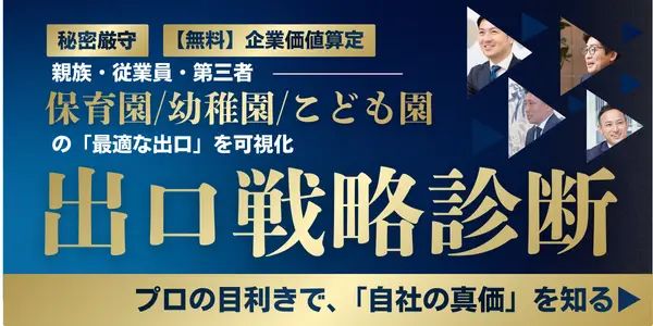 その保育園の経営状況によって変化します。株式を発行していない場合は幼稚園と同様にするしかありませんが、株式を発行していた場合、株式譲渡も選択肢のうちの一つとして入ってきます。
