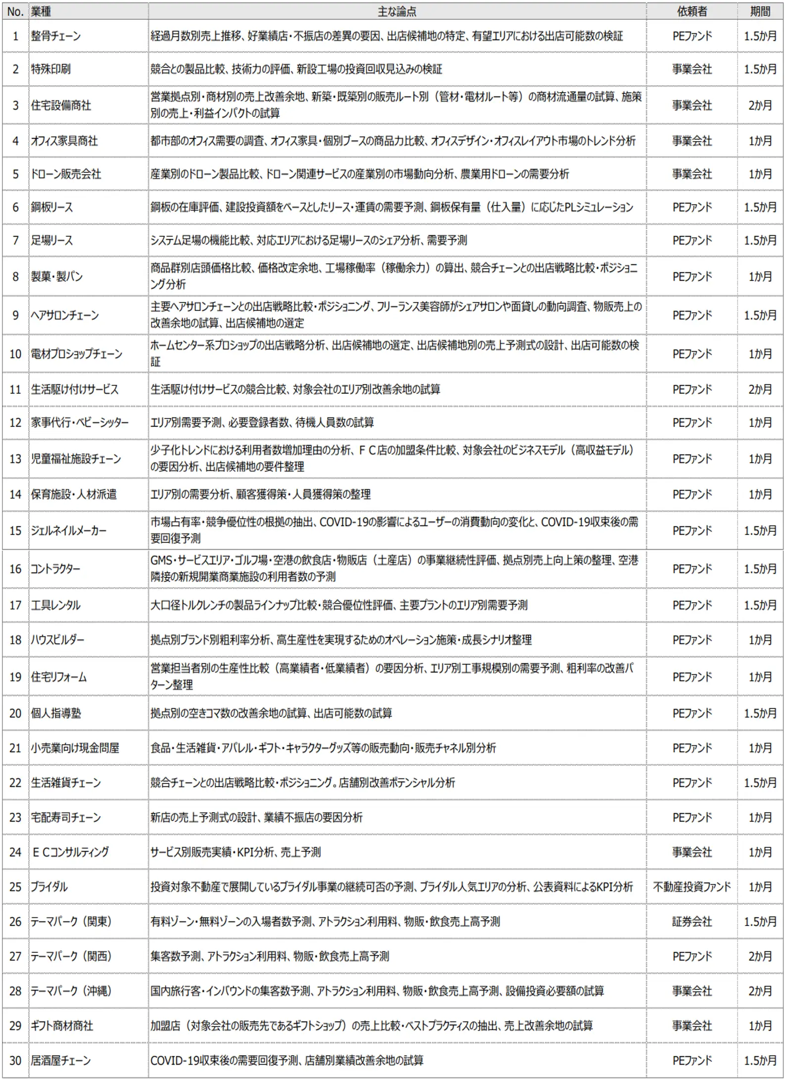 ご相談いただければご要望に合わせてお見積もり、サンプルを提出させていただきます。一般的な実施項目は下記のような形になります。・市場動向調査・競合動向分析・事業性評価・収益予測作成・法人税調査、間接税調査等
