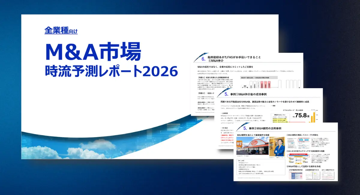全業種の経営者に届けるM&Aレポート。出口戦略としてM&Aを考え始めたら、まず読んでいただきたい2026年度のM&A市場の時流がわかるレポ-トです。