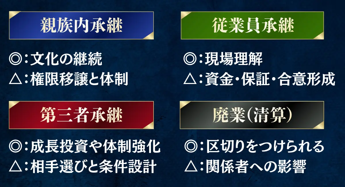 結論ありきではありません。親族内承継・従業員承継・廃業(清算)も含めて選択肢を整理します。