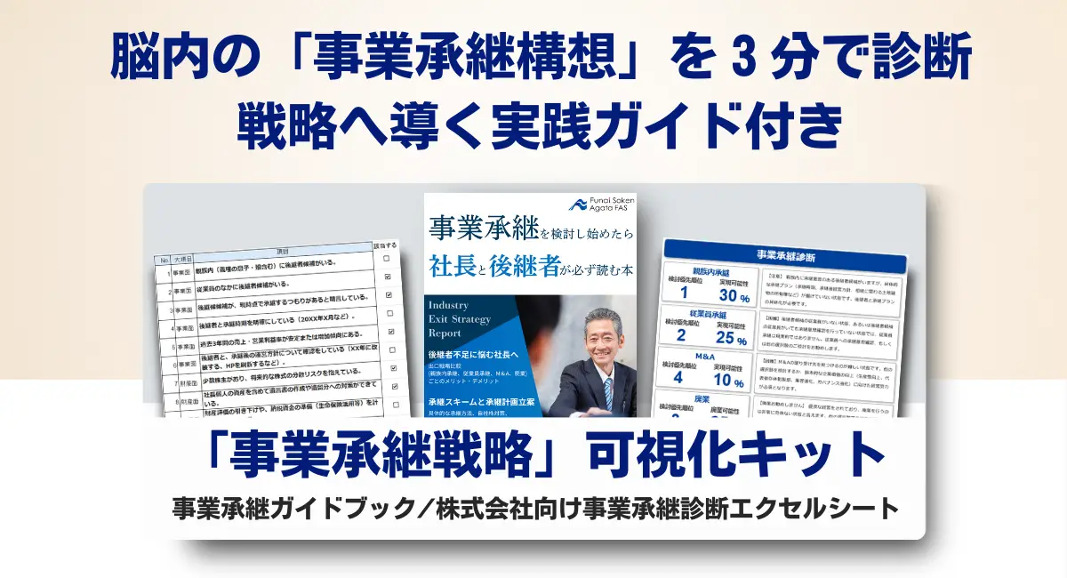 出口戦略を考え始めた経営者まずこちらをお読みください。「成長・承継・売却」のすべてが分かる事業承継・ M&A必携資料3点セット。